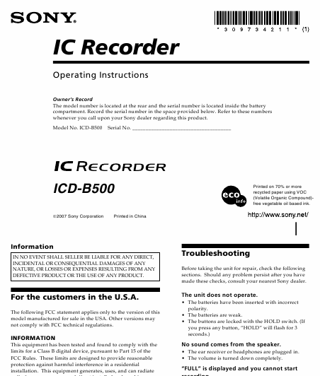 SONY ICD-B500 Mode emploi Anglais