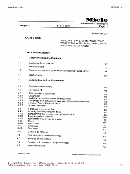 MIELE W 861 Manuel de service Français