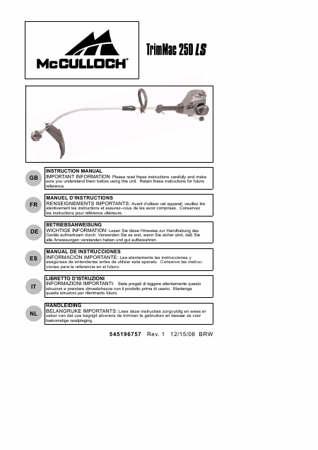 Telecharger MCCULLOCH TrimMac 250 LS Mode emploi Anglais (13 Pages) 12.90 EUR
