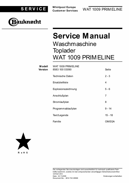 Telecharger BAUKNECHT WAT 1009 Primeline Manuel de service Allemand (18 Pages) 15.90 EUR