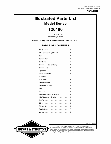 BRIGGS & STRATTON 126400 Lista de peças Inglês