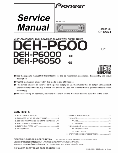 PIONEER DEH-P600 Manuel de service Anglais