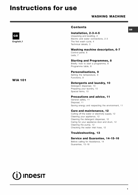 Baixar INDESIT WIA 101 Instruções Inglês (16 Pages) 12.90 EUR