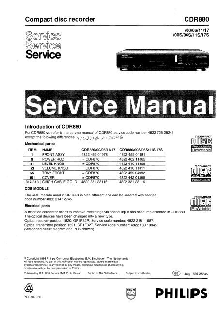 Telecharger PHILIPS CDR880 Manuel de service Anglais (65 Pages) 59.90 EUR