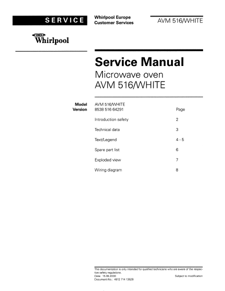 Download WHIRLPOOL AVM 516/WHITE Service Manual English (8 Pages) 15.90 EUR