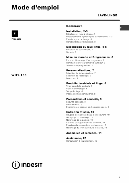 Baixar INDESIT WITL 100 (WITL100) Instruções Francês (12 Pages) 12.90 EUR