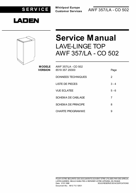 Baixar LADEN AWF 357/LA (AWF357LA) Comete 502 Manual de serviço Francês (9 Pages) 39.90 EUR