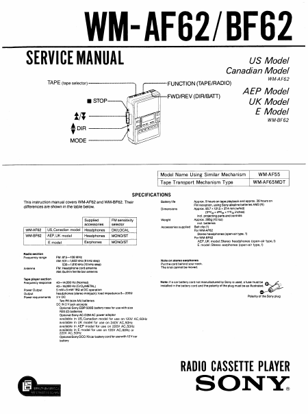 Download SONY WM-AF62 Serviceanleitung Englisch (19 Seiten) 15.90 EUR