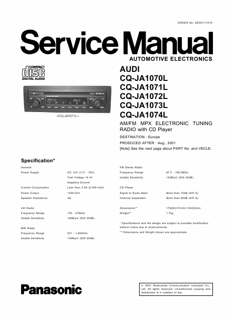 AUDI CQ-JA1074L (Audi Concert - Panasonic) Manual de serviço Inglês
