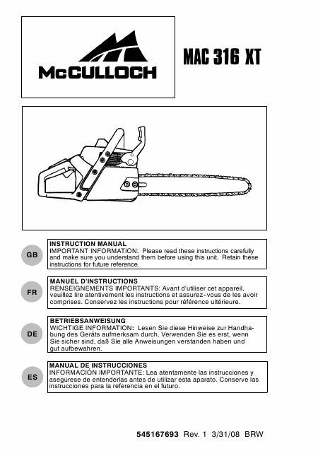 Telecharger MCCULLOCH MAC 316 XT Mode emploi Anglais (15 Pages) 12.90 EUR