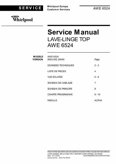 Descargar WHIRLPOOL AWE 6524 Manual de taller Francés (14 Páginas) 15.90 EUR