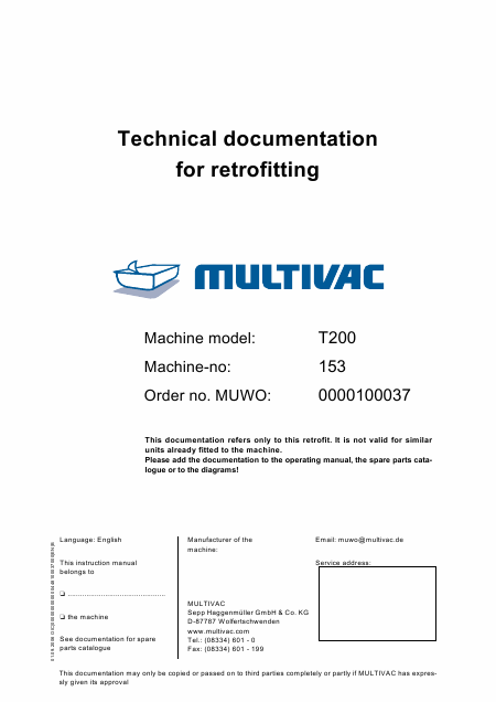 Baixar MULTIVAC T 200 Manual de Instalação Inglês (170 Pages) 15.90 EUR