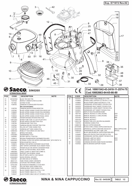 SAECO SIN026X Lista de piezas de repuesto Inglés