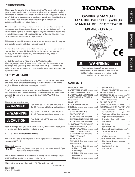 Telecharger HONDA GXV50 / GXV57 Mode emploi Anglais (16 Pages) 12.90 EUR