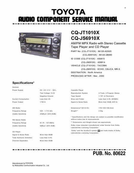 Telecharger TOYOTA CQ-JS6910X Manuel de service Anglais (42 Pages) 15.90 EUR