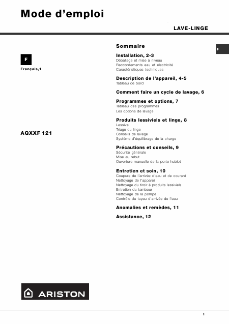 Download ARISTON AQXXF121 Users Guide French (12 Pages) 12.90 EUR