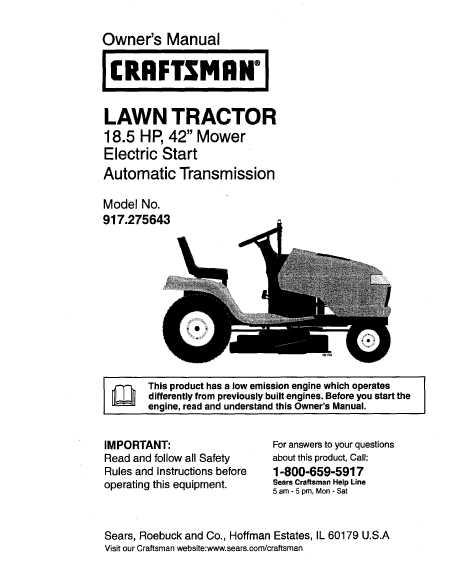 CRAFTSMAN 18.5 HP (917.275643) Users Guide English