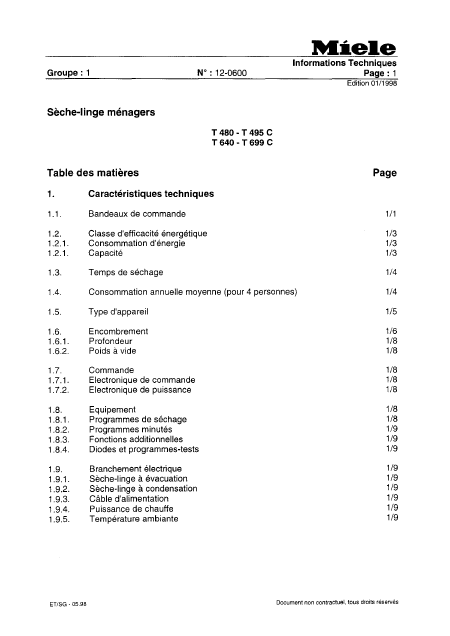 MIELE T 699 C (T699C) Manuale di servizio Francese