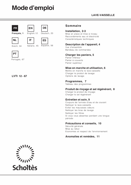 Telecharger SCHOLTES LVTI 12-67 Mode emploi Anglais (12 Pages) 12.90 EUR