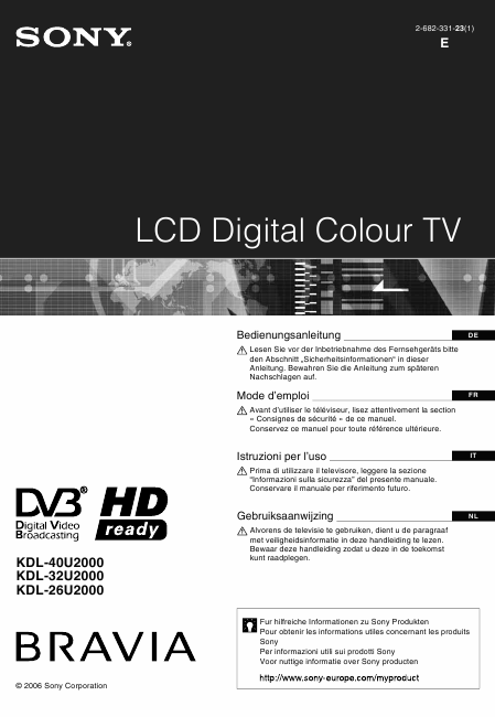 Telecharger SONY KDL-26U2000 Mode emploi Français (25 Pages) 12.90 EUR