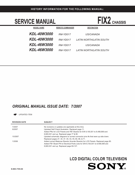 Telecharger SONY KDL-40W3000 Manuel de service Anglais (139 Pages) 15.90 EUR