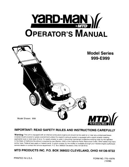 Telecharger YARD-MAN 999-E999 Mode emploi Anglais (32 Pages) 15.90 EUR
