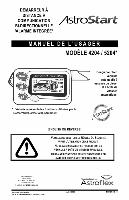 Download ASTROFLEX AstroStart 5204 Users Guide French (18 Pages) 12.90 EUR