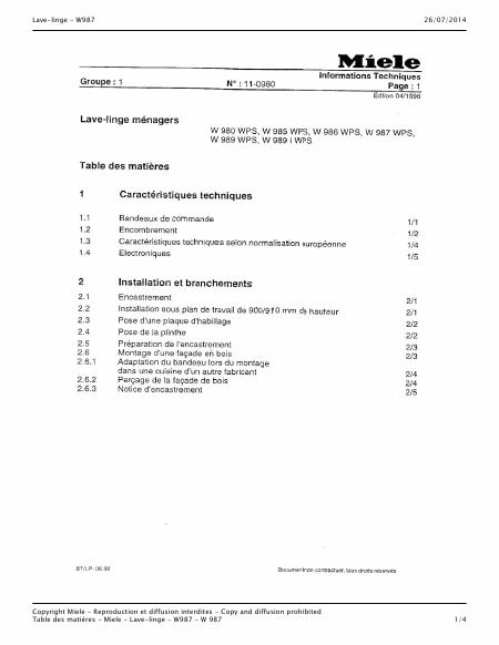 Telecharger MIELE W 987 WPS Manuel de service Français (60 Pages) 39.90 EUR