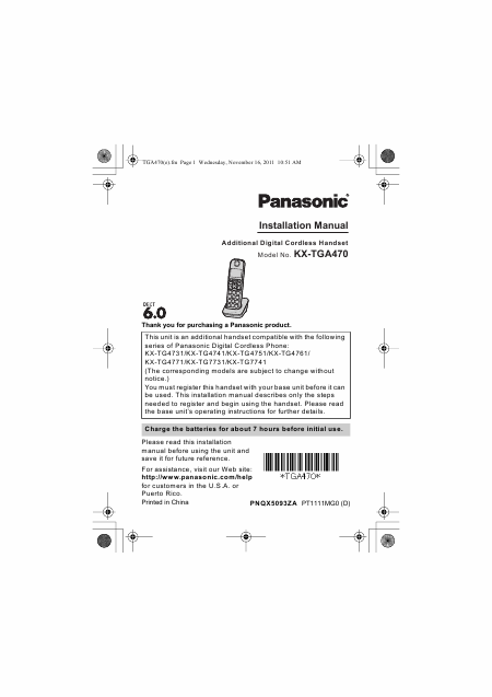 PANASONIC KX-TGA470 Manuel installation Anglais