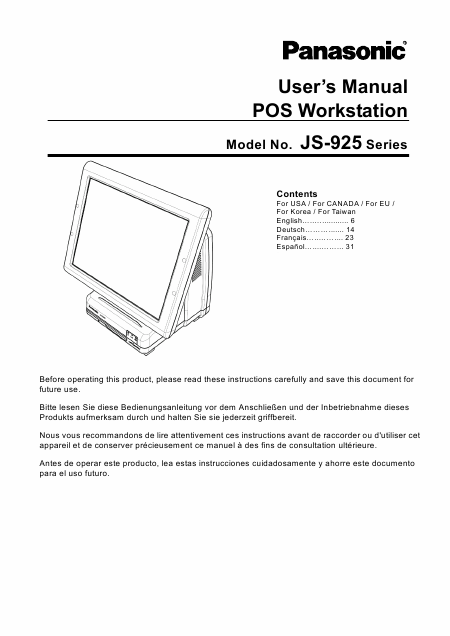 Baixar PANASONIC JS-925 Series (Europe) Manual de Instalação Inglês (10 Pages) 15.90 EUR