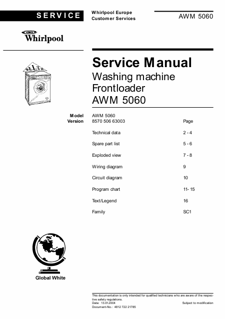 Download WHIRLPOOL AWM 5060 Service Manual English (16 Pages) 15.90 EUR