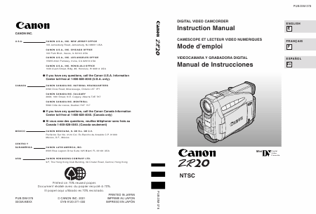 CANON ZR20 (NTSC) Mode emploi Anglais