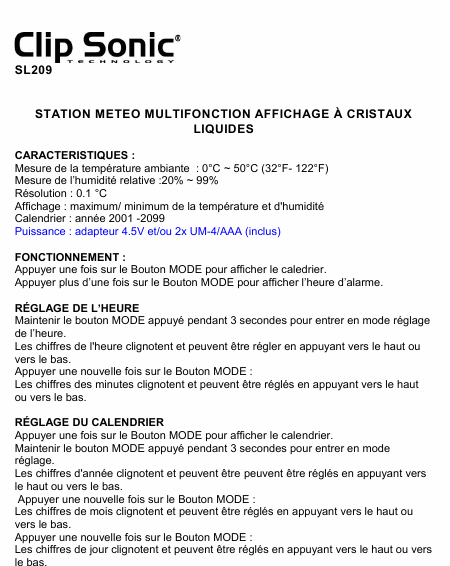 CLIP SONIC SL209 Mode emploi Français