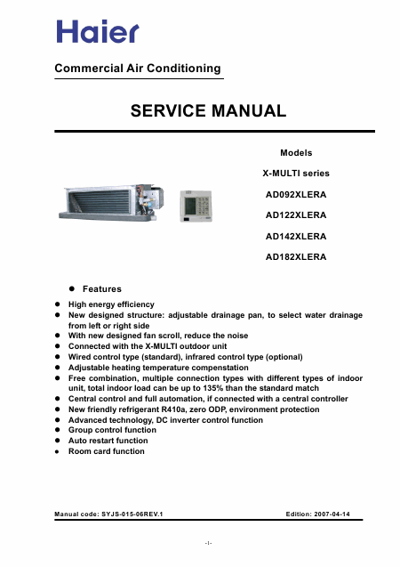 HAIER AD122XLERA X-Multi Series Manual de serviço Inglês