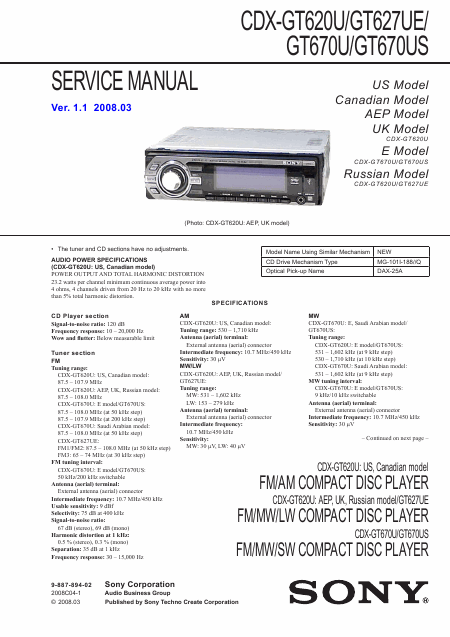SONY CDX-GT620U (CDXGT620U) Manual de serviço Inglês