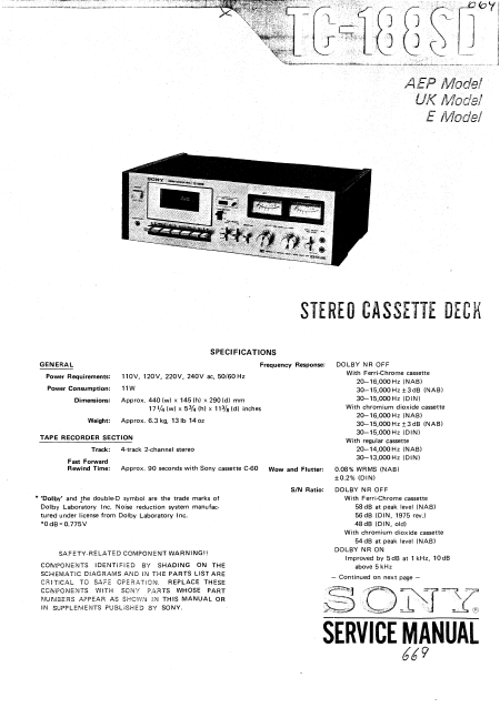 Baixar SONY TC-188SD Manual de serviço Inglês (26 Pages) 15.90 EUR