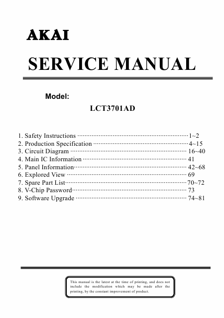 Baixar AKAI LCT3701AD Manual de serviço Inglês (83 Pages) 39.90 EUR