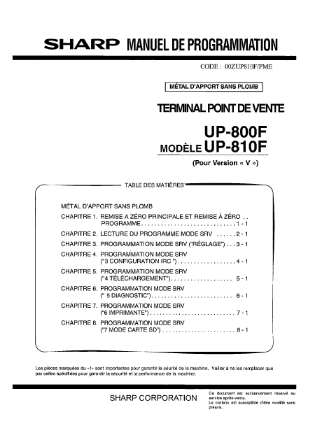 Baixar SHARP UP-800F (Manuel de programmation) Manual de Instalação Francês (62 Pages) 39.90 EUR