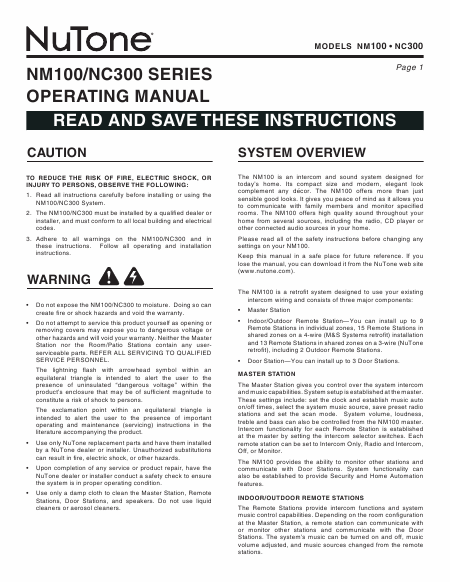 NUTONE NM100 Mode emploi Anglais