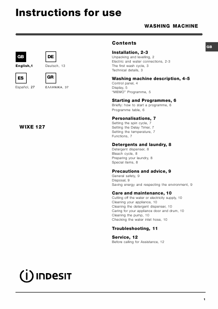 INDESIT WIXE 127 (WIXE127) Istruzione Inglese