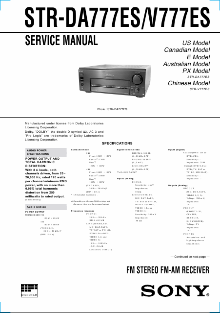 Telecharger SONY STR-DA777ES Manuel de service Anglais (80 Pages) 15.90 EUR