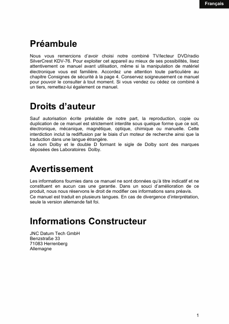 SILVERCREST KDV-76 Users Guide French