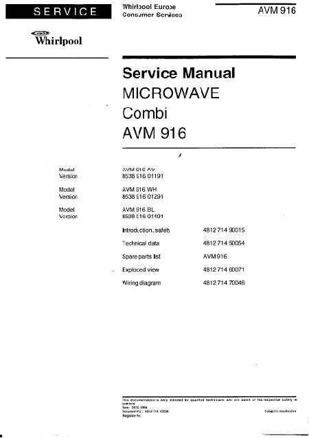 WHIRLPOOL AVM 916 (AVM916) Manual de serviço Inglês
