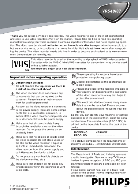 PHILIPS VR540 (VR540/07) Istruzione Inglese