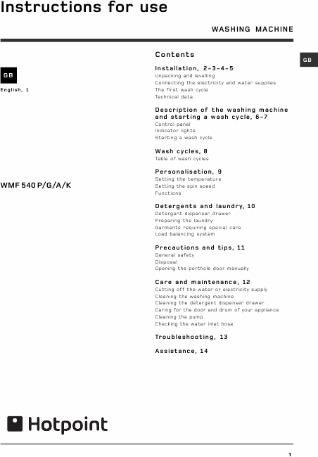HOTPOINT WMF 540 Istruzione Inglese