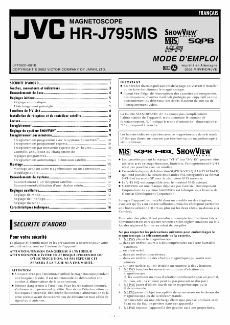 Download JVC HR-J795MS Users Guide French (16 Pages) 15.90 EUR