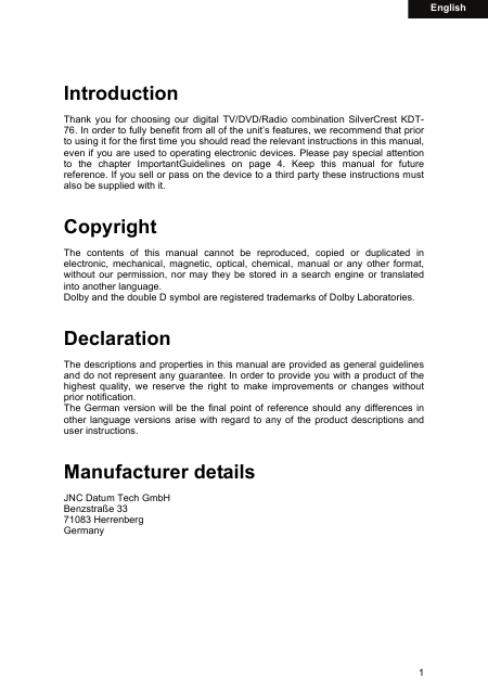 SILVERCREST KDV-76 Users Guide English