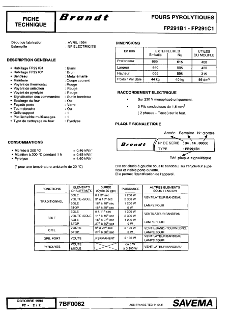 Telecharger BRANDT FP 291 B1 Manuel de service Français (7 Pages) 15.90 EUR