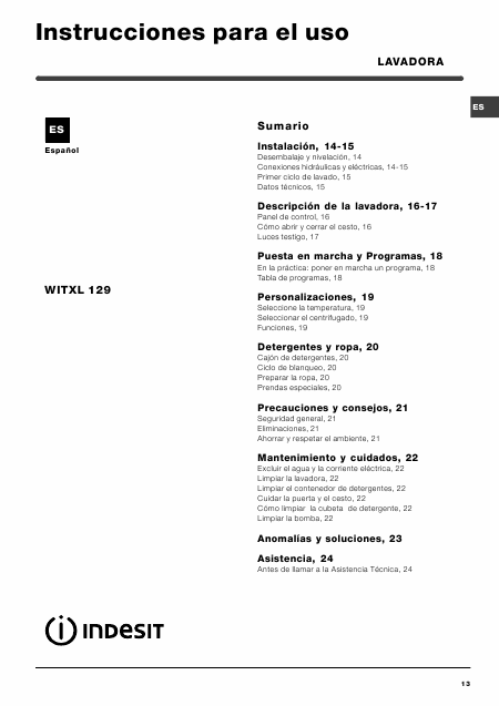 INDESIT WITXL 129 (WITXL129) Istruzione Spagnolo