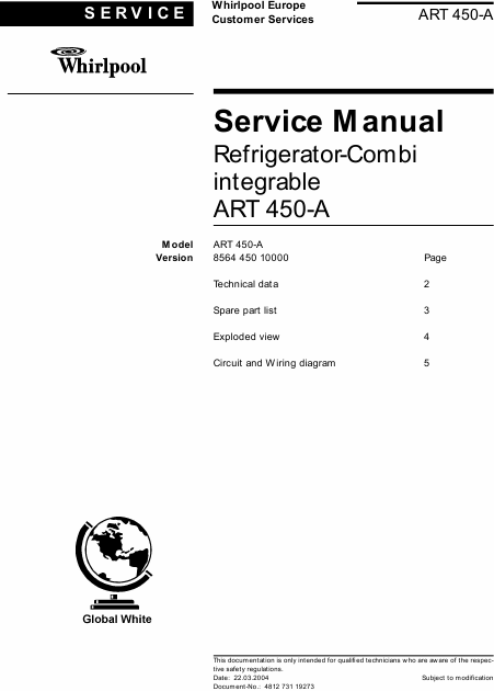 Telecharger WHIRLPOOL ART 450-A Manuel de service Anglais (5 Pages) 15.90 EUR